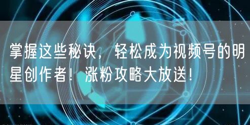 掌握这些秘诀,轻松成为视频号的明星创作者!通过明确目标、优质内容创作、善于运用推广技巧、定期分析优化、积极参与平台活动和持续学习提升,你将能在视频号领域脱颖而出,吸引大量粉丝关注。本文分享的涨粉攻略,希望能助你一臂之力,成为视频号领域的佼佼者!